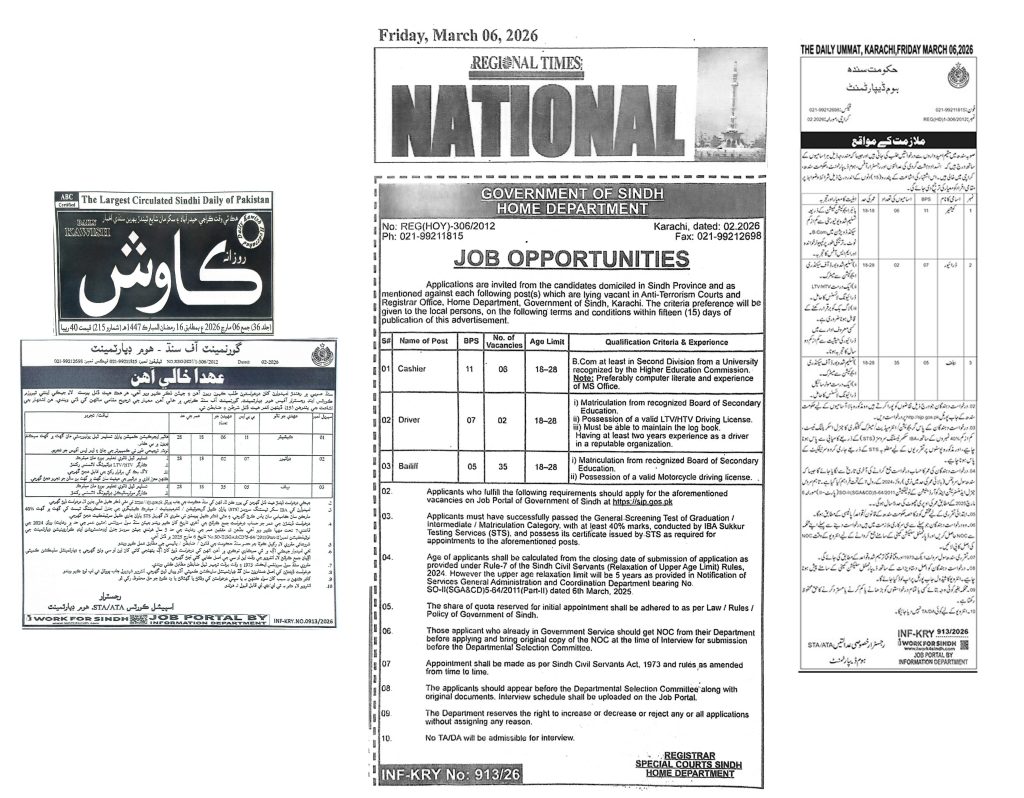 The Home Department, Government of Sindh has officially announced new career opportunities for the year 2026. Home Department Sindh Jobs 2026 These vacancies are specifically for the Anti Terrorism Courts and Registrar Office located in Karachi. If you are a resident of Sindh looking for a stable government career with competitive pay scales, this is your chance to join a prestigious department.