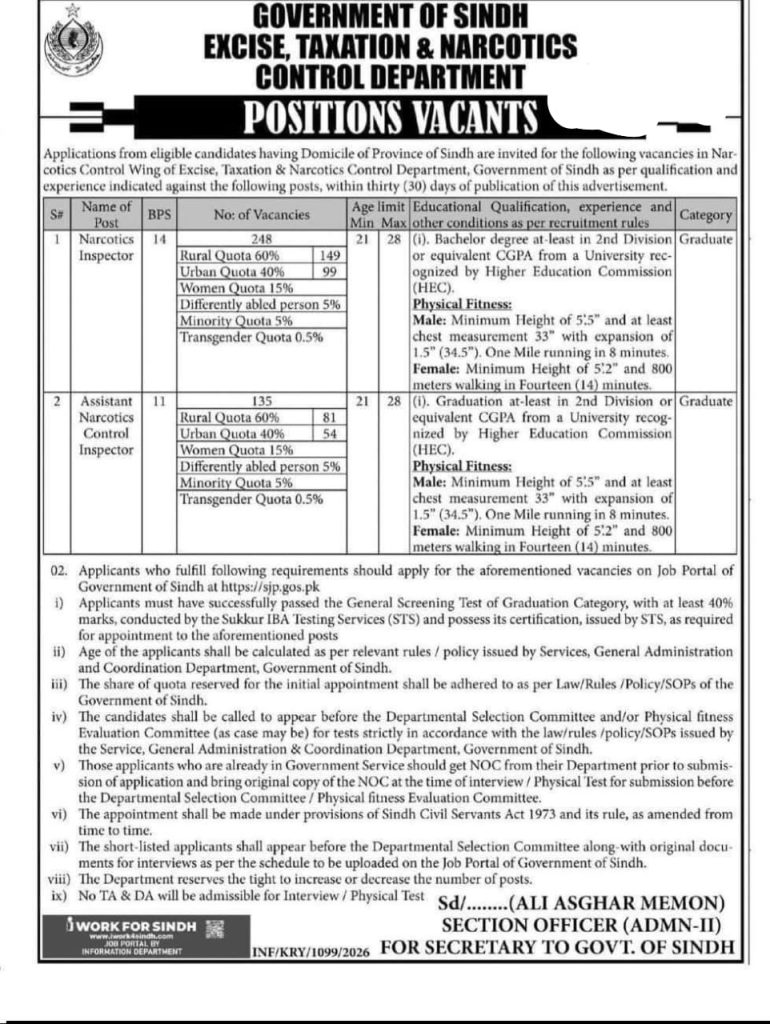 The Excise, Taxation & Narcotics Control Department, Government of Sindh, has officially announced a massive recruitment drive for 2026, offering a prestigious career path for graduates across the province. This is not just a job; it is a chance to join the frontline of law enforcement and revenue collection in Sindh. With Taxation & Narcotics Control Department Jobs 2026 383 vacancies for the posts of Narcotics Inspector (BPS-14) and Assistant Narcotics Control Inspector (BPS-11), this represents one of the most significant hiring phases for the department in recent years.